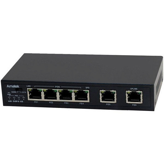 Amatek AN-S6P4-65 - Коммутатор на 6 портов (4 PoE+ порта + 2 порта Uplink): 4 порта 10/100Mbps RJ45, Auto-MDIX, PoE/PoE+ до 15.4/30 Вт каждый; + 2 порта 10/100Mbps RJ45 (Uplink). Поддержка IEEE 802.3af/at Power over Ethernet. Суммарная мощность PoE/PoE+ до 65Вт. Индикация: Link/Activity, Скорость, PoE, 220В. Таблица MAC адресов 2К, матрица 1,2 Гбит/с. Режим CCTV позволяет передавать данные на расстояние до 250 метров на скорости до 10 Мбит/с. Поддержка деления на 4 VLAN. Температура 0…+ 45°С. Встроенный блок питания AC ~220В. Размеры 190x130x35 мм.