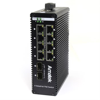 Amatek AN-SXGM10P8B HiPoE 90Вт - Промышленный управляемый коммутатор на 10 портов (4 HiPoE (90Вт) портов + 4 PoE+ портов + 2 слота SFP): 4 порта 100/1000M RJ-45 HiPoE (до 90 Вт каждый) + 4 порта 100/1000M RJ-45 PoE/PoE+ (до 15.4/30 Вт каждый) + 2 порта 10/100/1000M SFP (Uplink). Поддержка PoE (IEEE 802.3af/at). Суммарная мощность PoE портов до 480Вт. Функция PoE Watchdog - контроль и перезапуск устройств с PoE по питанию. Интерфейс управления WEB, SNMP, Telnet, консольный порт RJ45. Управление: VLAN (802.1q, QinQ), поддержка Spanning Tree (STP/RSTP/MSTP), QoS, зеркалирование портов, управление PoE. Безопасность: SSH, SSL, 802.1x, аутентификация доступа RADIUS/TACACS+, MAC Address Binding, ACL, фильтр TCP/UDP, IGMP(v2/v3, 256 групп), MLD (v1/v2) snooping, защита от широковещательных штормов, агрегация до 8 портов. Индикация: Link/Activity, Скорость, 220В. Таблица MAC адресов 8192 (8K), скорость коммутационной матрицы 32 Гбит/с. MTBF 100 000 часов. Защита портов от перенапряжения до 6000В (ESD). Рабочая темпера