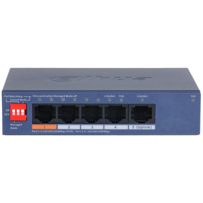 Dahua DH-CS4005-4GT-60 - 4-портовый гигабитный PoE коммутатор с функцией облачного управления Порты: 4 RJ45 10/100/1000Мбит/с (PoE/PoE+/Hi-PoE), 1 RJ45 10/100/1000Мбит/с (uplink); мощность PoE: порт 1 до 60Вт, порты 2~4 до 30Вт, суммарно до 60Вт; PoE watchdog, передача до 250м; питание: 53В(DC)