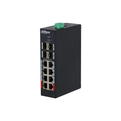 Dahua DH-HS4412-8ET-120 - 12-портовый управляемый коммутатор с PoE, промышленное исполнение Порты: 8 RJ45 10/100Мбит/с (PoE/PoE+/Hi-PoE/IEEE802.3bt), 4 SFP 1000Мбит/с (uplink); мощность PoE: порты 1~2 до 90Вт, порты 3~8 до 30Вт, суммарно до 120Вт; PoE watchdog; питание: 48-57В(DC); грозозащита: до 6кВ; рабочая температура: -30°С~+65°С; монтаж на DIN-рейку.