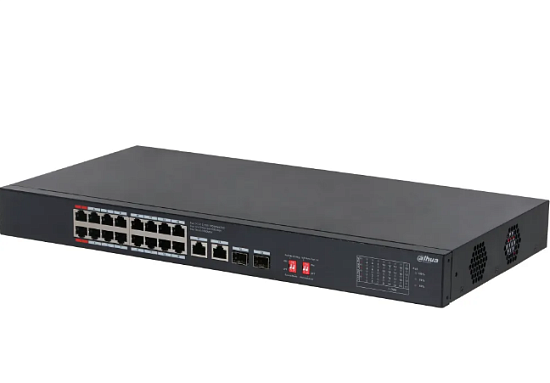 Dahua DH-S3220-16GT-190 - 16-портовый неуправляемый гигабитный коммутатор с PoE, уровень L2 Порты: 16 RJ45 10/100/1000Мбит/с (PoE/PoE+/Hi-PoE), 2 RJ45 10/100/1000Мбит/с (uplink), 2 SFP 1000Мбит/с (uplink); мощность PoE: порты 1~2 до 90Вт, порты 3~16 до 30Вт, суммарно до 190Вт; PoE watchdog; передача на 250м; питание: 100~240В(AC)