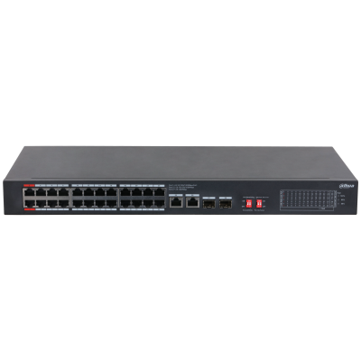 Dahua DH-S3228-24GT-375 - 24-портовый неуправляемый гигабитный коммутатор с PoE, уровень L2 Порты: 24 RJ45 10/100/1000Мбит/с (PoE/PoE+/Hi-PoE), 2 RJ45 10/100/1000Мбит/с (uplink), 2 SFP 1000Мбит/с (uplink); мощность PoE: порты 1~2 до 90Вт, порты 3~24 до 30Вт, суммарно до 375Вт; PoE watchdog; передача на 250м; питание: 100~240В(AC)