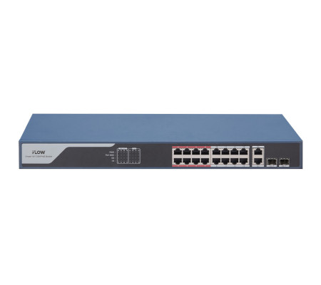 iFlow F-SW-EU620HPOE-V - Неуправляемый PoE-коммутаторL2, 16 гигабитных портов RJ45 PoE, 2 uplink порта 1000М RJ45, 2 гигабитных порта SFP, 802.3af/at/bt, порты 1-4 поддерживают HiPoE 90 Вт, общий бюджет PoE 227 Вт, порты 13-16 поддерживают режим...