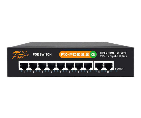 FX-POE8.2G 10 портов 10/100/1000 Мбит/с (IEEE802.3u 100BaseTX) из них 8 c поддержкой PoE (IEEE802.3at) до 30Вт на порт (HI POE) + два порта UPLINK 10/100/1000 Мбит/с, Суммарная мощность потребителей 120 Вт, таблица МАС адресов - 2К, пропускная способность 5.6Гбит\с, Буфер обмена 2Мб Режим 1: 1-8 порт 10/100 Base-T (PoE) до 100 метров Режим 2: 1-8 порт 10 Base-T (PoE) до 250 метров Габаритные размеры 199 x 136 x 45 мм, 220В встроенный блок питания.