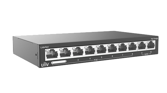 Uniview NSW2020-10T-LPOE-IN - 10 сетевых портов?100Mbps (RJ45), включая 8 PoE порта (IEEE802.3,IEEE802.3u,IEEE802.3az,IEEE802.3x,IEEE802.3af,IEEE802.3at), коммутационная способность 2Gbps, скорость пересылки пакетов 1.49Mpps, размер буфера 448Kbit, MAC 1K, бюджет мощности 60 Вт, максимальная мощность на порт 30Вт., Дальность передачи до 250 м в режиме наблюдения.