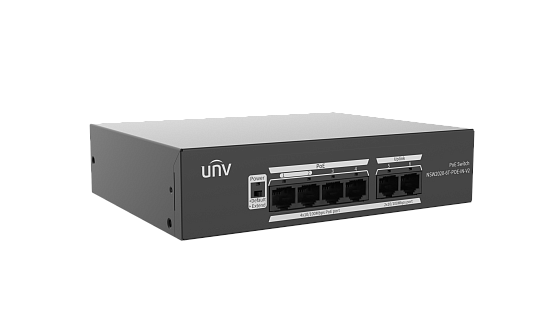 Uniview NSW2020-6T-POE-IN-V2 - 6 сетевых портов x 100Mbps (RJ45), включая 4 PoE порта (IEEE802.3, IEEE802.3u, IEEE802.3az, IEEE802.3x, IEEE802.3af, IEEE802.3at), коммутационная способность 1.2Gbps, скорость пересылки пакетов 0.90Mpps, размер буфера 570Kbit, MAC 2K, общий бюджет мощности 65 Вт, максимальная мощность на порт 30Вт., Дальность передачи до 250 м в режиме наблюдения.