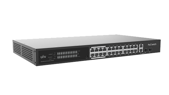 Uniview NSW3000-25GT1GP1GC-POE-IN - Управляемый коммутатор, управление на веб-интерфейсе и на приложении, 24 сетевых PoE портa×1000Mbps (RJ45)+1×1000Mbps порт + 1×1000Mbps SFP порт + 1×1000Mbps комбинированный порт, коммутационная способность 54 Gbps, скорость пересылки пакетов 40.176 Mpps, размер буфера 4M bit, MAC 8K, общий бюджет мощности 370 Вт, максимальная мощность на порт 30Вт, встроенный вентилятор, Дальность передачи до 250 м в режиме наблюдения.