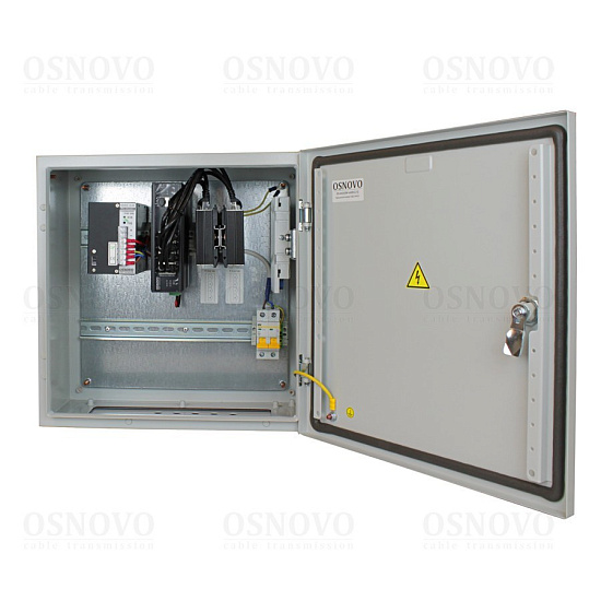 OS-443(SW-60812/I) Уличный коммутатор c грозозащитой портов PoE на базе уличной станции OSNOVO OS-441. Порты: 6 x FE (10/100Base-T) с PoE (до 30W) + 2 x FE (10/100Base-T) с PoE (до 60W) + 1 x GE (10/100/1000Base-T) + 2 x GE SFP (1000Base-X). Суммарный бюджет PoE до 240W. Режим антизависания и режим удлинения линий связи по 8-ми PoE портам до 250м (скорость до 10Мбит/с). Металлический шкаф (ШxВxГ): 400х400х210мм, питание AC195-265V, оптический кросс, температурный диапазон -40…+50гр., исполнение IP66