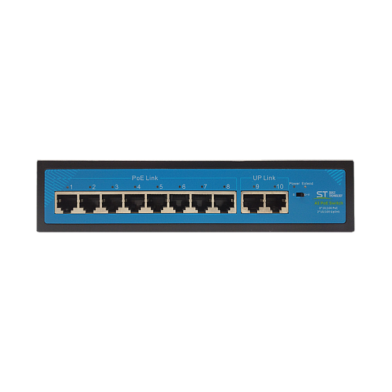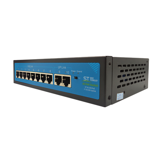 Space Technology ST-S84POE (2M/96W/A), (версия 3) - Источник питания, Switch POE 8-ми портовый для обеспечения проводных сетей напряжением 48В, PoE порты: 8 х (10/100 Мбит/с), UpLink порты: 2 х (10/100 Мбит/с), Max.пропускная сп-ть: 100 Мбит/канал, Р(ном) каждый порт (Вт): 12 Вт, Р(макс) каждый порт (Вт): 30 Вт, Тип РоЕ: А, защита от КЗ, Extend 250м., VLAN