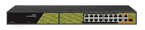 Tantos TSn-16FP18G2S1 - 18 портовый неуправляемый PoE коммутатор, 15x100 Мбит/с PoE порта + 1 PoE порт 1000 Мбит/с (14 портов 802.3af/at, максимальная мощность PoE 30 Вт на порт, 2 порта 802.3af/at/bt, максимальная мощность PoE 60 Вт на порт) + 2x1000 Мбит/с порта Uplink + 1 SFP 1000 Мбит/с порт. Общий бюджет PoE 300 Вт. Автоматический PoE watchdog, автоматический выбор длины линии и скорости работы (до 130 м скорость 100 Мбит/с, от 130 м до 250 м скорость 10 Мбит/с), встроенный блок питания, грозозащита и защита от статического электричества, -30...+60°С.