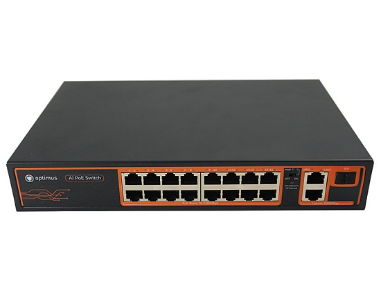 Optimus U1I-16F/2G/1S - 16 портов до 100 Мбит/с RJ-45, PoE+, 2 порта до 1000 Мбит/с RJ-45, Uplink, 1 порт до 1000 Мбит/с SFP, Uplink, PoE Стандарт - IEEE 802.3af/at, Контакты PoE 1/2+,3/6-, Бюджет PoE 240 Вт, Коммутационная способность 9,2 Гбит/с, Дальность передачи до 250 метров, режимы работы коммутатора 250м/100м, Питание АС 100~250В, 50/60Гц, комплект крепления в 19″ стойку, 270х180х45 мм, вес: 1,25 кг