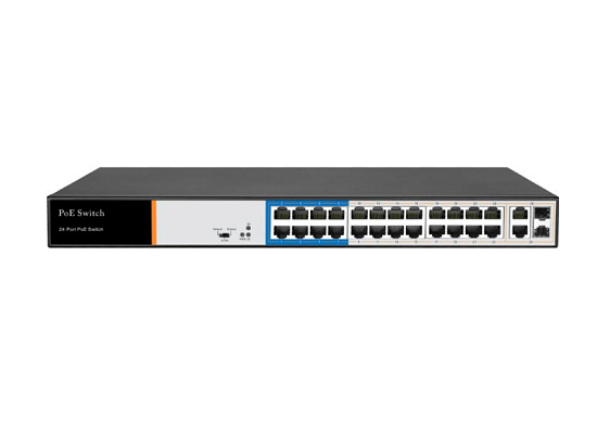 Optimus UMG1-26/24P_v.1 - 24 POE + 2 Uplink, из них: 24 POE порта 10/100Mbps RJ-45 с поддержкой Auto-MDIX, + 2 порта 1000Mbps RJ-45 Uplink или 2 порта Gigabit SFP, порты 1-8 имеют переключение режима Extend 10Mbps RJ-45 с поддержкой Auto-MDIX с длиной линии до 250...