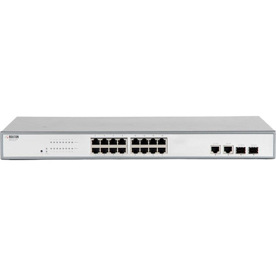 Roxton UNS-1016F2S - Неуправляемый сетевой коммутатор, 16 портов 10/100 Мбит/с (10/100Base-TX), Auto-MDI/MDIX, 2 комбо-порта 10/100/1000BASE-T/SFP, Store-and-forward, 220 В, 15 Вт, от 0°C до 55°C, 440x275x44.5 мм (rackmount), 4.878 кг.