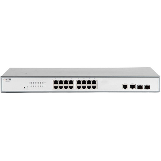 Roxton UNS-1016F2SP - Неуправляемый сетевой коммутатор, 16 портов 10/100 Мбит/с (10/100Base-TX), поддержка PoE+(IEEE 802.3at-2009), Auto-MDI/MDIX, 2 комбо-порта 10/100/1000BASE-T/SFP, Store-and-forward, 220 В, 400 Вт, от 0°C до 55°C, 440x275x44.5 мм (rackmount), 4.97 кг.