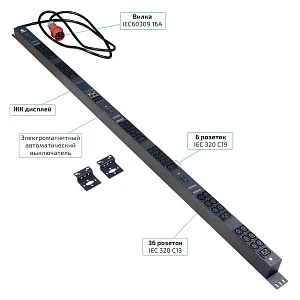 Описание: Cabeus SMART-PDU-16-3P-36C13-6C19-I309-CM (12603c) - Блок розеток для 19" шкафов, вертикальный, 36 розеток IEC 320 C13, 6 розеток IEC 320 C19,В В 3 фазы, 16А, 3х16А автомата защиты,В В 400В,В В удаленный мониторинг/управление, шнур 3м 5х2,5мм с вилкой IE 60309