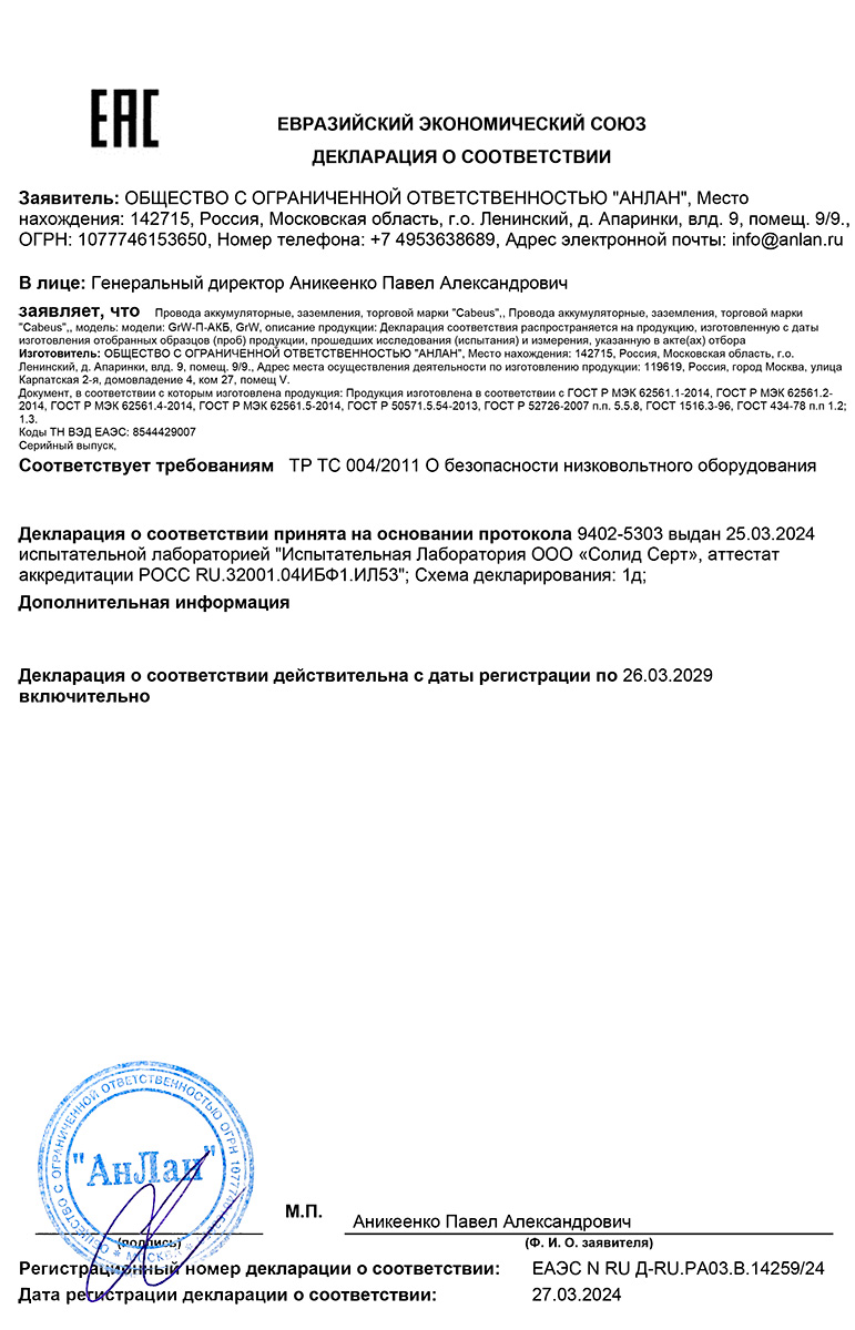Cabeus GrW-16-1000 (11556c) - Провод заземления медный гибкий 16 мм2, 1 м, с наконечниками