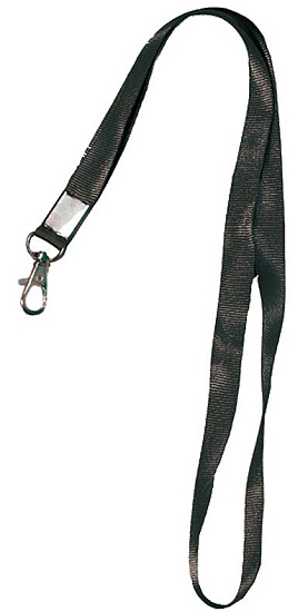 Лента шёлковая с металлическим карабином-защёлкой. Предназначена для ношения бейджей, карт и т.п. Цвет - чёрный