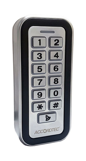 AccordTec AT-CP210EM-W - Кодонаборная панель со встроенным контроллером и считывателем карт EM-Marine с памятью до 2000 пользователей, с механическими кнопками, питание DC 12V, IP68, антивандальный корпус, материал-нержавеющая сталь, подсветка кнопок. Рабочая температура:- 45°С~+ 60°С, 115x50x20 мм. Масса брутто 455 г.