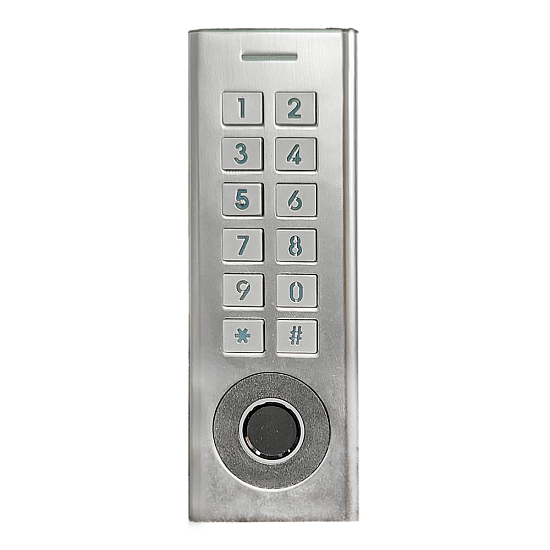 Tantos TS-KBD-Bio 2 - Кодонаборная панель со считывателем отпечатков пальцев, считывателем карт Em-Marine и автономным контроллером на 1000 пользователей (99 отпечатков, 888 карт/кодов обычных пользователей). Возможна работа в режиме считывателя и кодовой панели с передачей информации через Wiegand. Питание 12-18 В пост.тока / 150 мА. Корпус из цинкового сплава, класс защиты IP66. Температурный диапазон: -30...+60°С.