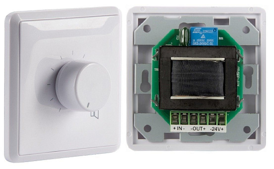 Roxton AT-50 - Аттенюатор с реле принудительного включения, резистивный делитель, 50 Вт, 100 В, 11 положений, врезной монтаж, 86х86х40 мм, пластик белого цвета