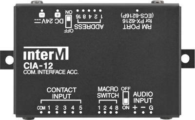 Блок преобразует поступающие управляющие сигналы c микрофонных панелей в сигналы интерфейса RS-422. Устройство имеет 5 управляющих входных контактов и позволяет управлять только пятью зонами в системе оповещения. Для управления большим количеством зон потребуется дополнительные блоки CIA-12, которым присваивается соответствующий адресный номер и режим работы.