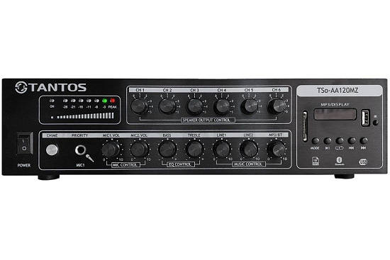 Tantos TSo-AA120MZ - Компактный трансляционный усилитель, 120 Вт, 6 зон оповещения, Выходы на громкоговорители: 120 Вт RMS/100 В, низкоомный выход 120 Вт (не менее 8 Ом), USB, FM-тюнер, Bluetooth, mp3, 2 линейных входа, 1 линейный выход, 2 микрофонных входа (MIC-1 приоритетный) Воспроизводимые форматы SD карты: MP3, WMA, габариты: 285×205×70 мм