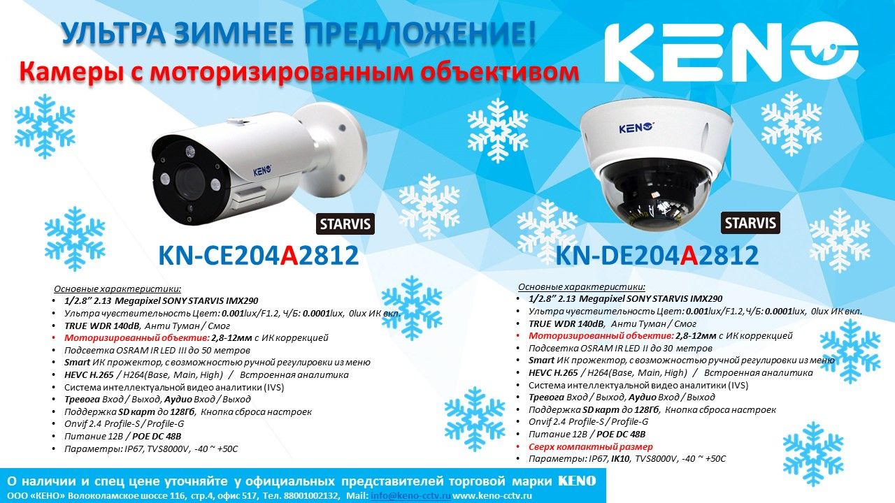 KENO KN-CE204A2812BR - ПРОЕКТ: Оптимизация потоков для работы с ситемами СКОУ и ЕЦХД Встроенный сопроцессор I/O комманд для обработки Meta данных. IP-камера, день/ночь, матрица 1/2,8” 2,13 Megapixel SONY STARVIS IMX290, 1920x1080 пикс.,...