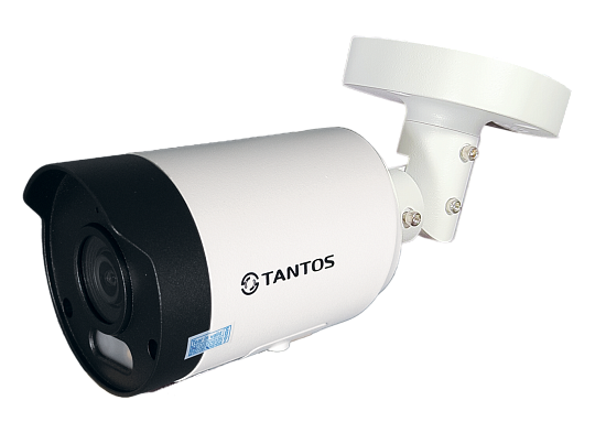 Tantos TSi-Pe55FD - IP видеокамера уличная цилиндрическая 5 Мп, со встроенной сиреной и красно-синим стробоскопом, с ИК и белой подсветкой.