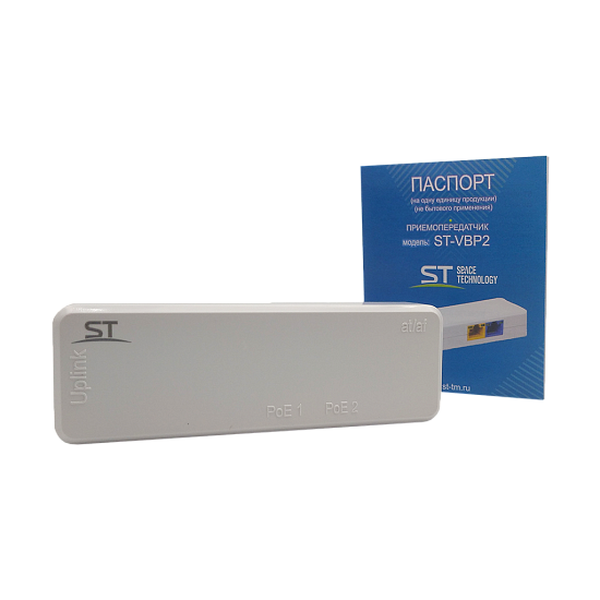 Space Technology ST-VBP2 - Приемопередатчик, Удлинитель сигнала по UTP кабелю. Предназначен для приема и последующей передачи данных по проводным UTP линиям связи 5-й и 6-й категории, Порты подключения.Вход: разъем RJ-45 (PoE + Данные) -1 шт, Порты подключения.Выход: разъем RJ-45 (PoE + Данные) – 2 шт, Скорость соединения: 10/100 Мбит/с, Макс. пропускная способность: 100Мбит/с каждый порт, Сетевые стандарты: IEEE 802.3, IEEE 802.3u, IEEE802.3af/at/bt, Требование к кабелю: 8-жильный кабель категории 5 и выше (≤100м), Потребляемая мощность: 0.5Вт, Температура эксплуатации: От -45°С до 60°С, Габаритные размеры ИП: 102мм*34мм*20мм
