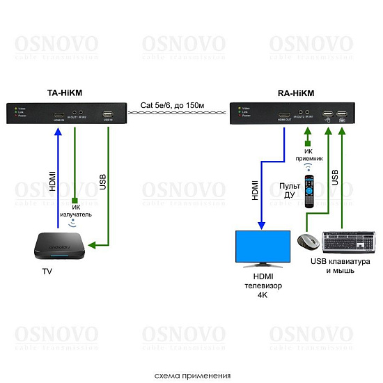 TA-HiKM+RA-HiKM Комплект для передачи HDMI, USB и ИК управления по кабелю витой пары (CAT5e/6) до 150м. Разрешение до 4K2K(3840x2160,60Гц). Поддержка HDMI 2.0 и HDCP 2.2. Порты USB предназначены только для подключения...