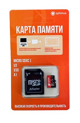 Optimus MicroSDXC 128Gb - Micro SDXC, объем памяти 128 гб, запись до 50 МБ/с, чтение до 90 МБ/с, Рабочая температура от 25°C до +80 °C, Комплектация:Карта памяти – 1 шт., SD адаптер – 1 шт.
