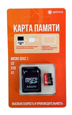 Optimus MicroSDXC 256Gb - Micro SDXC, объем памяти 256 гб, запись до 60 МБ/с, чтение до 90 МБ/с, Рабочая температура от 25°C до +80 °C, Комплектация:Карта памяти – 1 шт., SD адаптер – 1 шт.