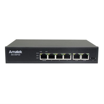 Описание: Amatek AN-S6P4D с HiPoE (80Вт) - Коммутатор на 6 портов (1 HiPoE порт, 3 PoE+ порта, 2 порта FE Uplink): 4 порта 10/100Mbps с PoE: 1 порт PoE/PoE+/HiPoE (60 Вт) и 3 порта PoE/PoE+ до 15.4/30 Вт; 2 порта 10/100Mbps RJ45 (Uplink). Поддержка IEEE 802.3af/at/bt Power over Ethernet. Суммарная мощность PoE до 80Вт. Поддержка определение зависания PoE устройств c перезагрузкой по PoE (WatchDog) Индикация: Link/Activity, Скорость, PoE, 220В. Таблица MAC адресов 2К, матрица 1,2 Гбит/с. Режим CCTV позволяет передавать данные на расстояние до 250 метров на скорости до 10 Мбит/с. Поддержка деления на 4 VLAN. Температура 0…+ 45°С. Встроенный блок питания AC ~220В. Размеры 190x130x35 мм. Кронштейн крепления на стену/потолок.