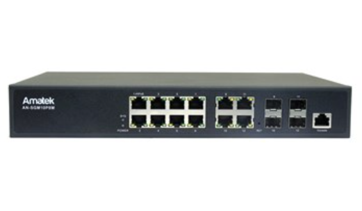 Описание: Amatek AN-SGM10P8M c HiPoE - Управляемый L2+ коммутатор на 12 GE портов (1 HiPoE порт, 7 PoE+ портов + 4 Combo Uplink порта): 1 порт 100/1000Mbps RJ45, Auto-MDIX, HiPoE до 60 Вт; 7 портов 100/1000Mbps RJ45, Auto-MDIX, PoE/PoE+ до 15.4/30 Вт каждый; + 4 RJ45/SFP Combo порта 100/1000Mbps (Uplink). Поддержка IEEE 802.3af/at/bt Power over Ethernet. Суммарная мощность PoE до 150Вт. Интерфейс управления WEB, SNMP, CLI, консольный порт RJ45. Управление: VLAN (802.1q), поддержка Spanning Tree (STP/RSTP/MSTP, ERPS, EAPS), QoS, SNMP, зеркалирование портов, управление PoE. Безопасность: SSH (v1/v2), SSL (v3), TLS (v1), HTPPS, 802.1x, аутентификация доступа RADIUS/TACACS+, ACL, IGMP, MLD, агрегация до 8 портов. Индикация: Link/Activity, Скорость, 220В. Таблица MAC адресов 8К, матрица 128 Гбит/с. Грозозащита: 3кВ. Температура -20…+ 55°С. Питание AC 110-240В. Безвентиляторная схема охлаждения. Размеры 295x195x45 мм. Высота 1U. Кронштейн для монтажа в 19-дюймовую стойку в комплекте.